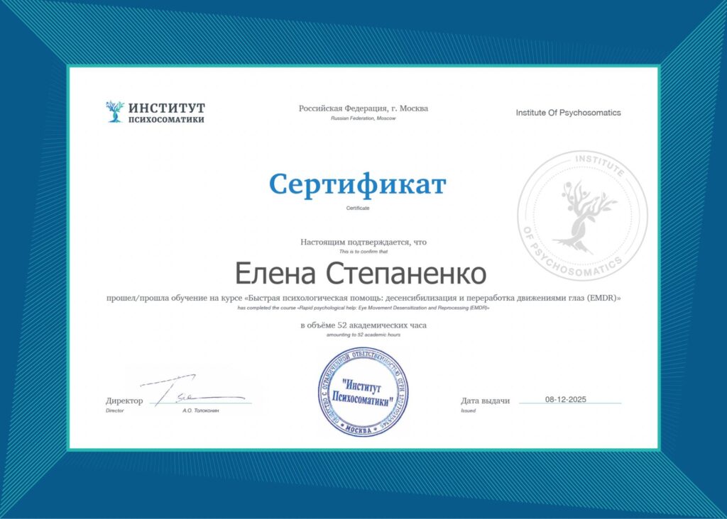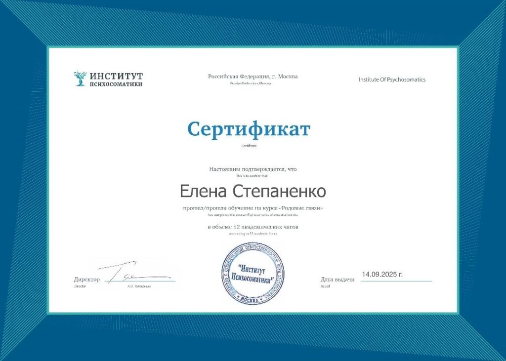 Меня зовут Елена Степаненко, и я являюсь профессиональным психосоматологом. За годы своей практики помогла многим людям наладить отношения в паре, в семье, с другими людьми. Помогла освободиться от депрессии, тревожности, стресса, эмоционального выгорания, страхов. неуверенности в себе и так далее. Помогла исцелиться полностью от многих заболеваний. А также улучшить финансовое состояние тех. кто пришел именно с этим запросом.